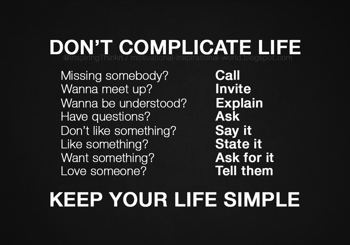 I feel we sometimes make our life complicate to avoid having negative feelings. Communication QuotesLife QuotesRelationship Quotes. Life Love Missing Someone Risk. The message was posted by Dr. People did that all on their own. Mar 6 2013 - Explore danica mansos board why complicate LIFE on Pinterest. See more ideas about great quotes words of wisdom cool words. Life is short keep it simple but never lose sight of what you want and never lose the courage to pursue it. What will be will be.