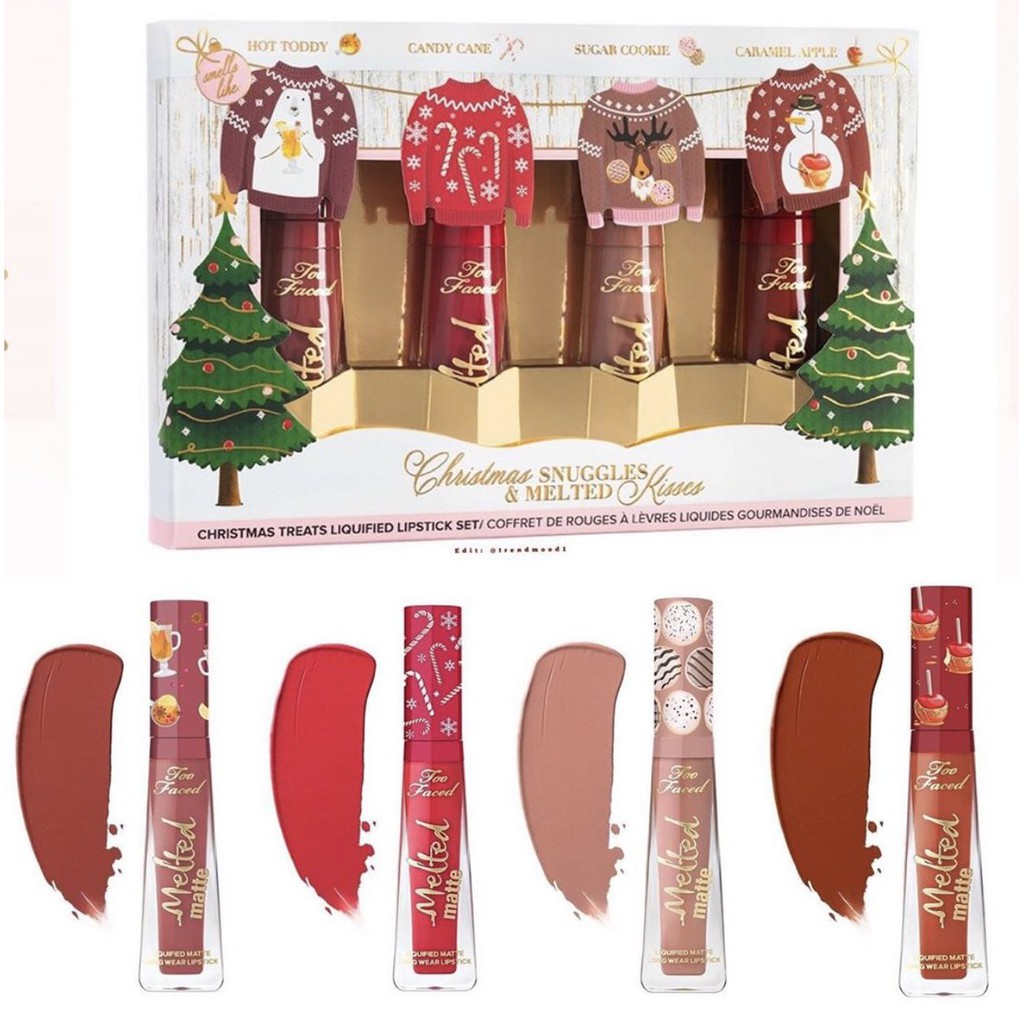 Too Faced Melted Matte Lipstick in limited edition Christmas Snuggles Melted Kisses Liquid Lipstick in Caramel Apple - Caramel Terracotta Red Brown 3ml1oz Enriched with avocado oil vitamin E hyaluronic filling spheres and smells like a different. Too Faced Salted Caramel Mini Eye Shadow Palette A limited edition palette for rich high pigmented seductive looks. It is best to familiarize yourself with the item prior to purchasing.